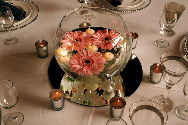Πάρε διάφανα γυάλινα μπολ γέμισε τα με λίγο νερό και τοποθέτησε μέσα λουλούδια ή ακόμα και φέτες από λεμόνι δίνοντας χρώμα και άρωμα στο χώρο σου όπως φαίνεται παρακάτω...
